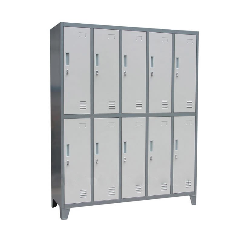 Locker Metalico DobleModelo LKD-10 Características TécnicasEstructura de Acero Laminado 0,6 mm.Puertas de 0,8 mm y Patas 1,5 mm.5 Cuerpos Doble 10 PuertasPuertas con porta tarjetas, celosía de ventilación, manilla,bandeja interior, porta candado.Ventilación en puertas, que permite la circulación del aire y evita exceso de humedad.Pintura polvo color gris, previo decapado y fosfatado. MedidasAlto 1.70 mts.Ancho 137 cm.Fondo 45 cm. VentajasLas terminaciones interiores del cuerpo vienen planchadas y sus puertas son montadas sobre quicios invisibles que le permiten su giro y desmontaje con facilidad.UsosEmpresas, bodegas, colegios,minimarket, oficinas. etc.