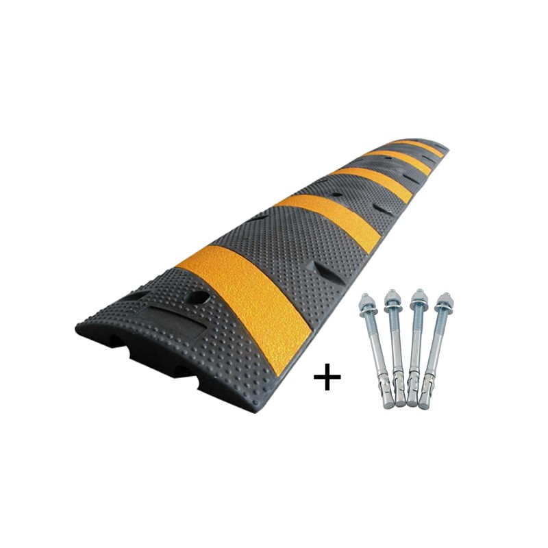 Las franjas amarillas facilitan su visualización y los orificios (4) permiten instalarlos sobre pisos asfáltico u hormigón, mediante pernos de fijación.